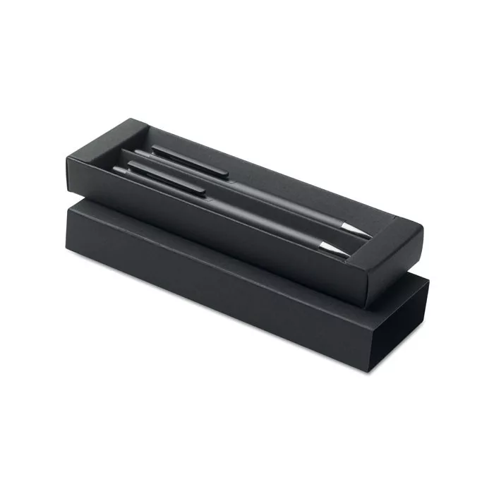 Újrahasznosított alumínium tollkészlet, golyóstollal és grafit, tintamentes tollal. Kéken író betéttel. Újrahasznosított papírdobozban.