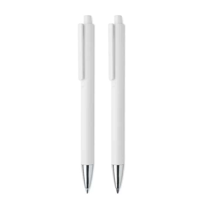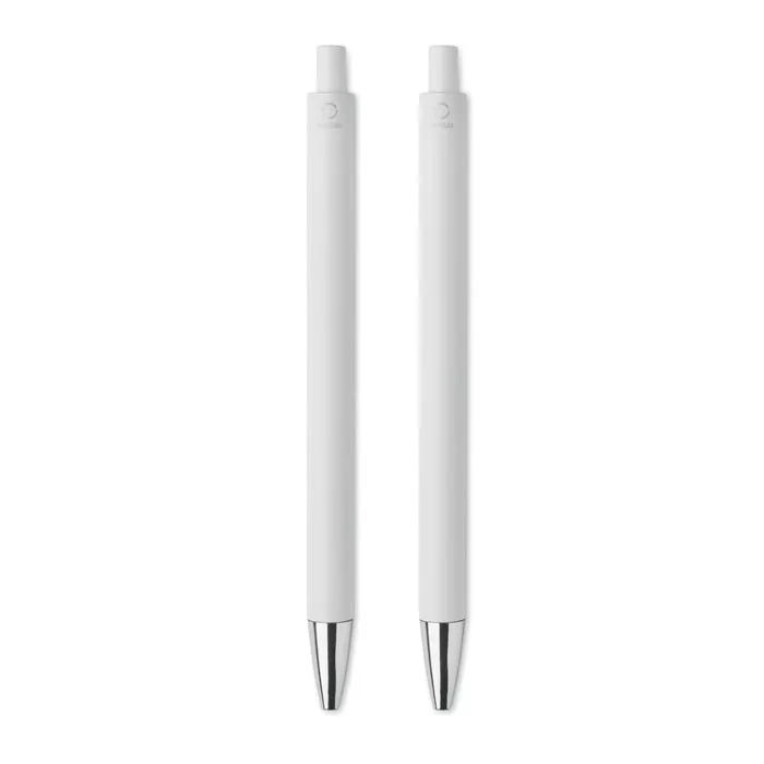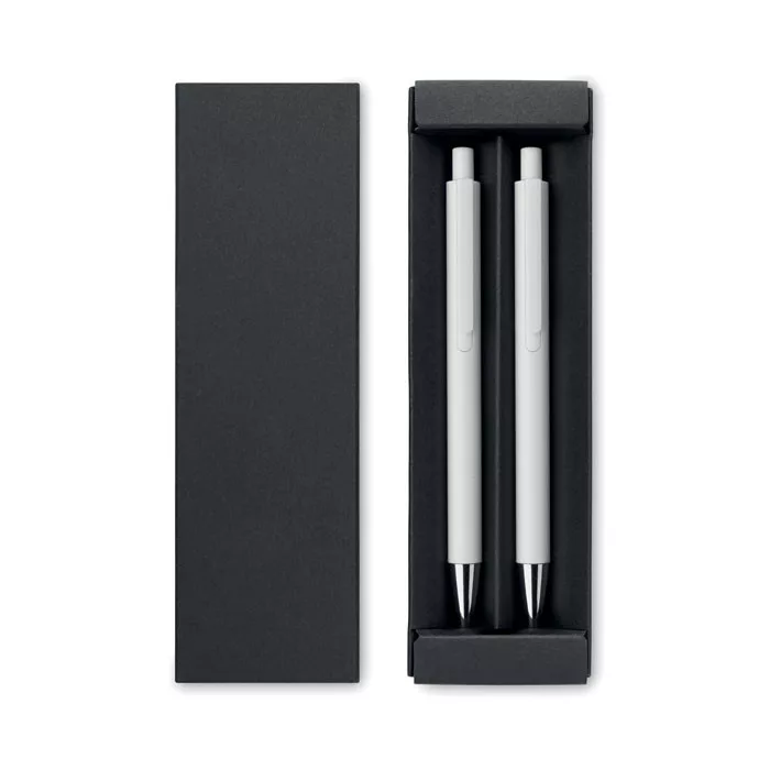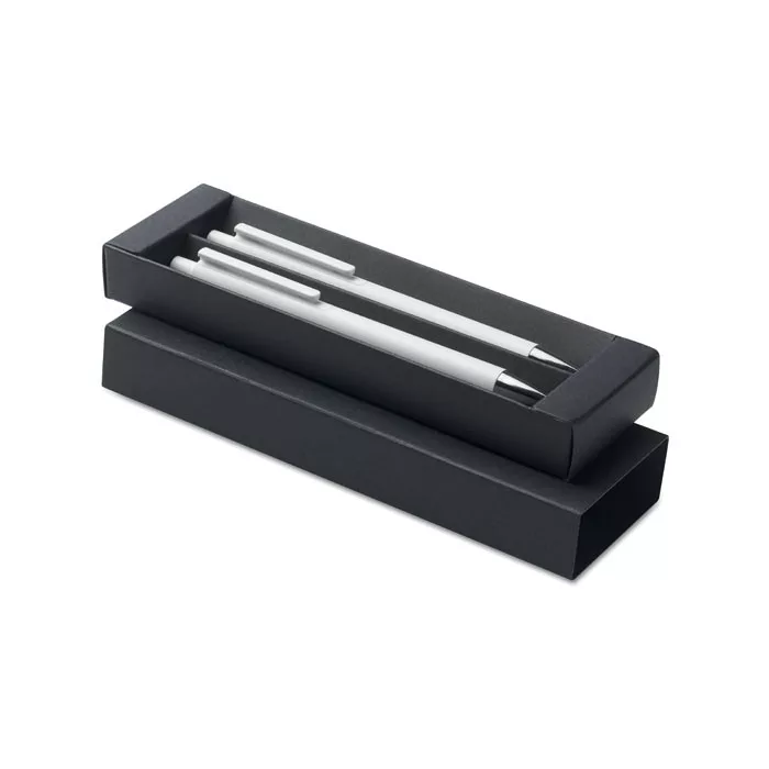 Újrahasznosított alumínium tollkészlet, golyóstollal és grafit, tintamentes tollal. Kéken író betéttel. Újrahasznosított papírdobozban.