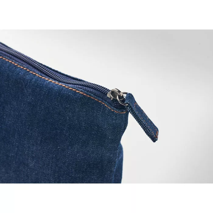 Kozmetikai táska cipzárral, 50% újrahasznosított festett pamut farmeranyagból és 50% pamutból. 250 g vastag anyag. Tároljon ebben a piperetáskában sminkeszközt, parfümöt és egyéb kozmetikumot. A farmer anyag egyedi megjelenést kölcsönöz ennek a stílusos táskának.