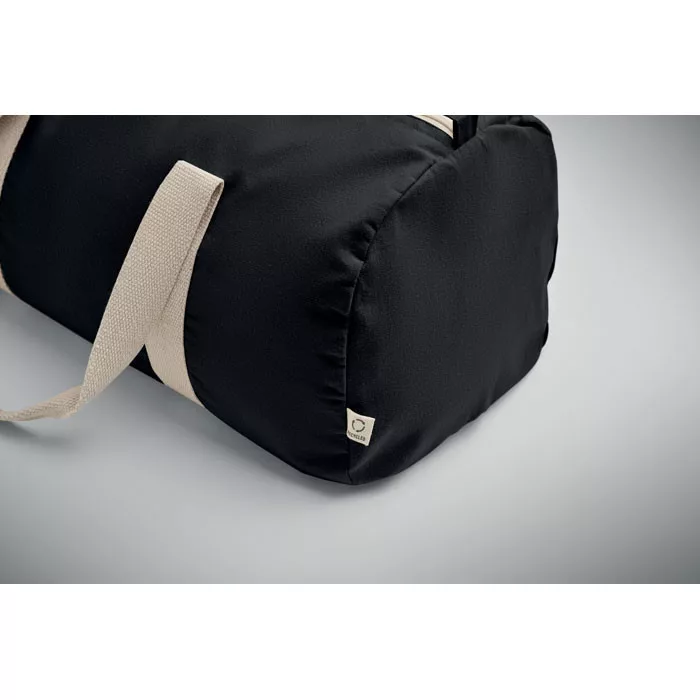 Sport- vagy utazótáska cipzáras oldalsó rekesszel és cipzáras belső zsebbel, 320 g/m² vastag újrahasznosított pamutból (80%) és újrahasznosított poliészterből (20%), hosszú fülekkel.