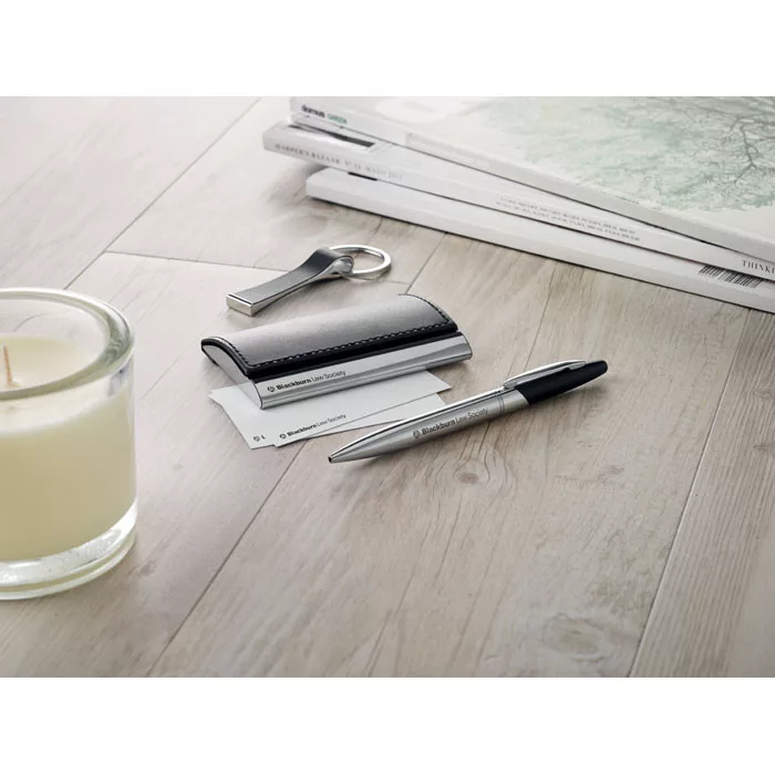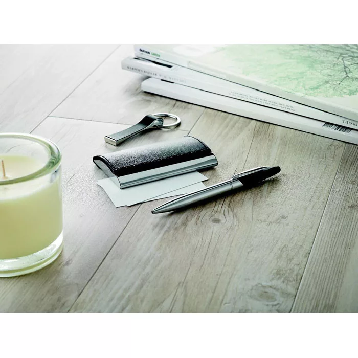 Üzleti ajándék szett dobozban. Tartalma: csavarmechanikás fém golyóstoll feketén író betéttel, rozsdamentes acél és PU kulcstartó, névjegykártya tartó.
