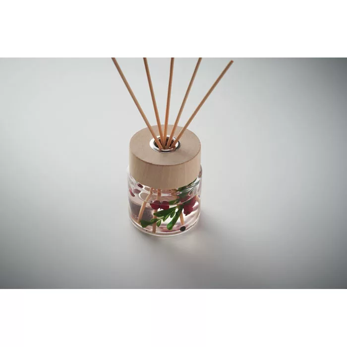 Illat diffúzor 6 nádpálcikával, virág dekorációval. Üveg fiola fa fedéllel. Illatanyag: vanília. Űrtartalom: 100 ml.