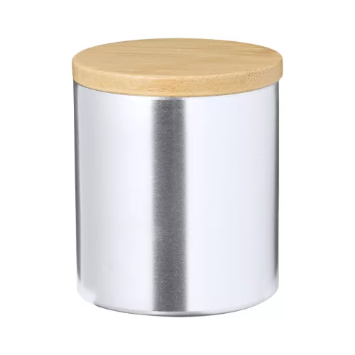 Vanília illatú gyertya alumínium tartóban, bambusz fedővel.