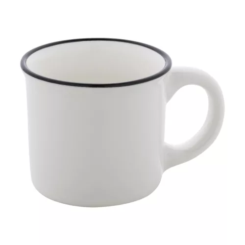 Mini vintage kerámia bögre fekete peremmel, belül fehér kívül színes bevonattal, 90 ml. Kraft papír dobozban.