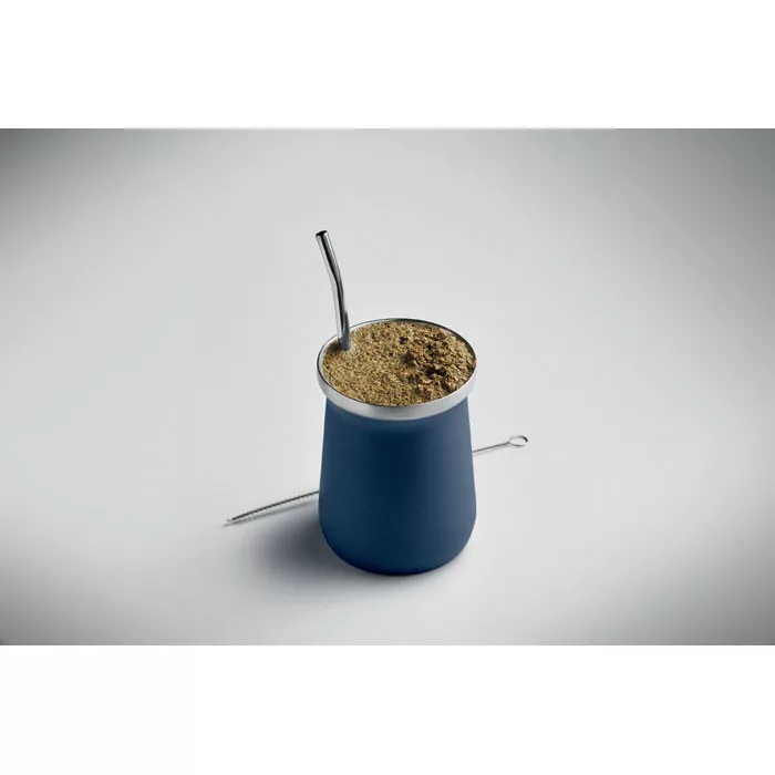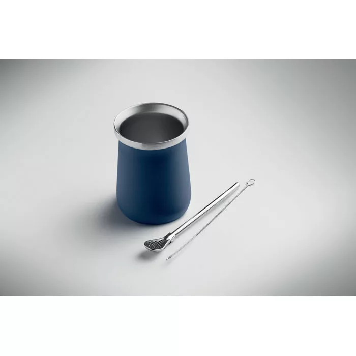 Duplafalú yerba mate pohár újrahasznosított rozsdamentes acélból (90% újrahasznosított és 10% rozsdamentes acél). Rozsdamentes acél bombilla szívószállal és tisztítókefével. Űrtartalom: 240 ml.