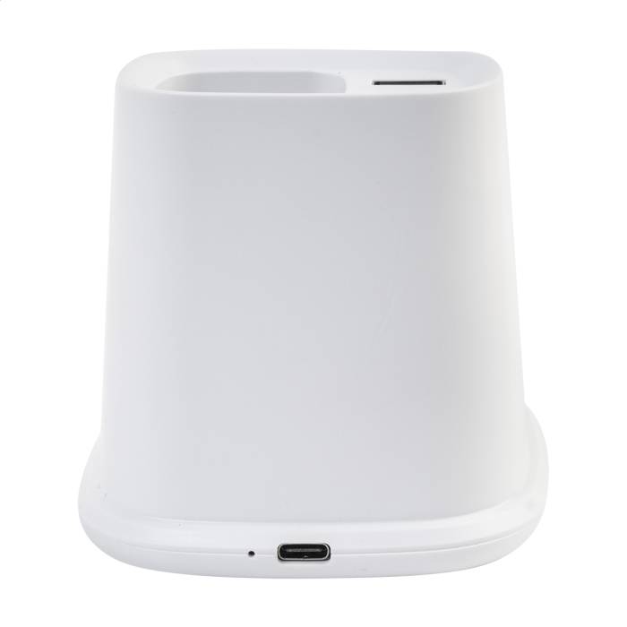 Újrahasznosított ABS multifunkcionális asztali tolltartó mobiltartóval, beépített vezeték nélküli gyorstöltővel (10W), 1 USB és 1 USB-C töltő porttal. USB töltőkábellel.