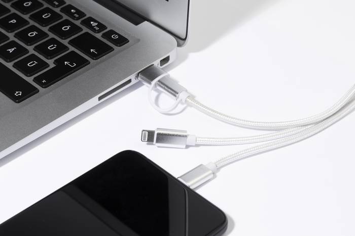 Újrahasznosított alumínium és RPET USB töltőkábel kulcstartóval. Micro USB, USB-C és Lightning csatlakozókkal. USB és USB-C bemenetekkel.