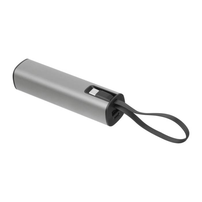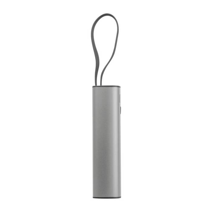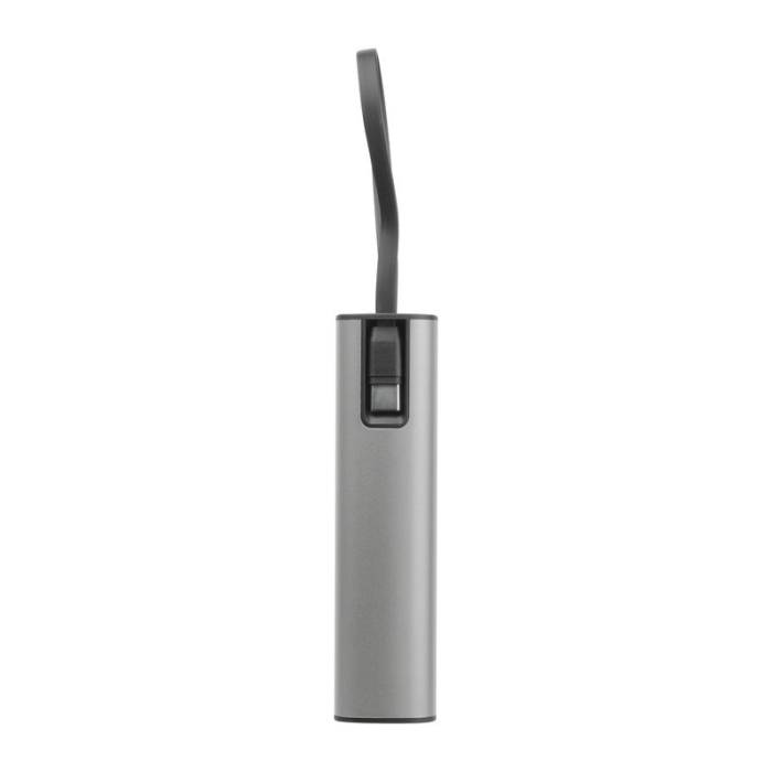 Alumínium házú power bank, amely 5 000 mAh kapacitású lítium-ion akkumulátort, töltöttségi szintjelzőt és beépített USB-C töltőkábelt tartalmaz. A csomagban egy 30 cm hosszú Type A - Type C töltőkábel is megtalálható.