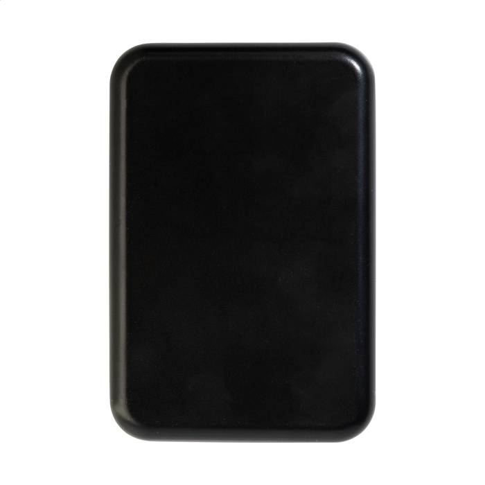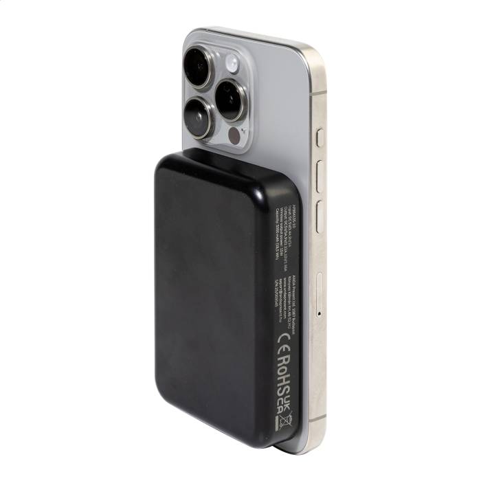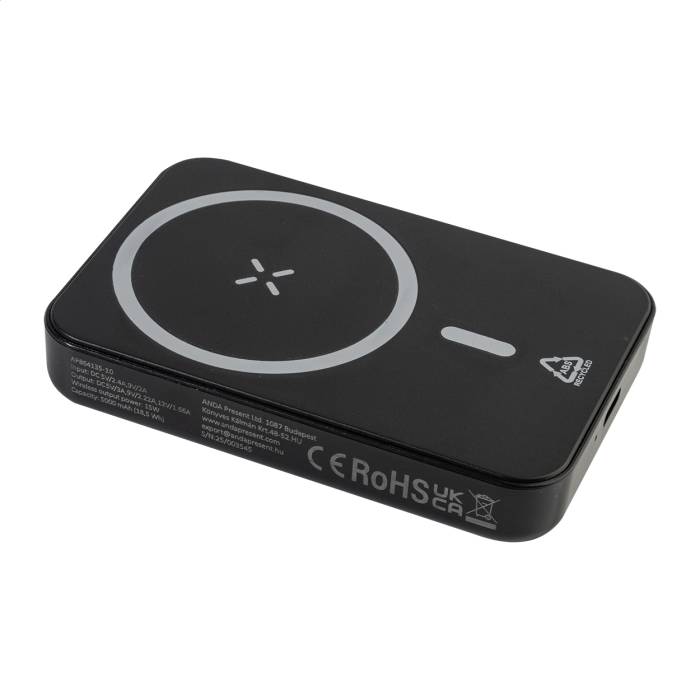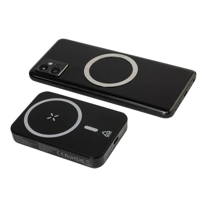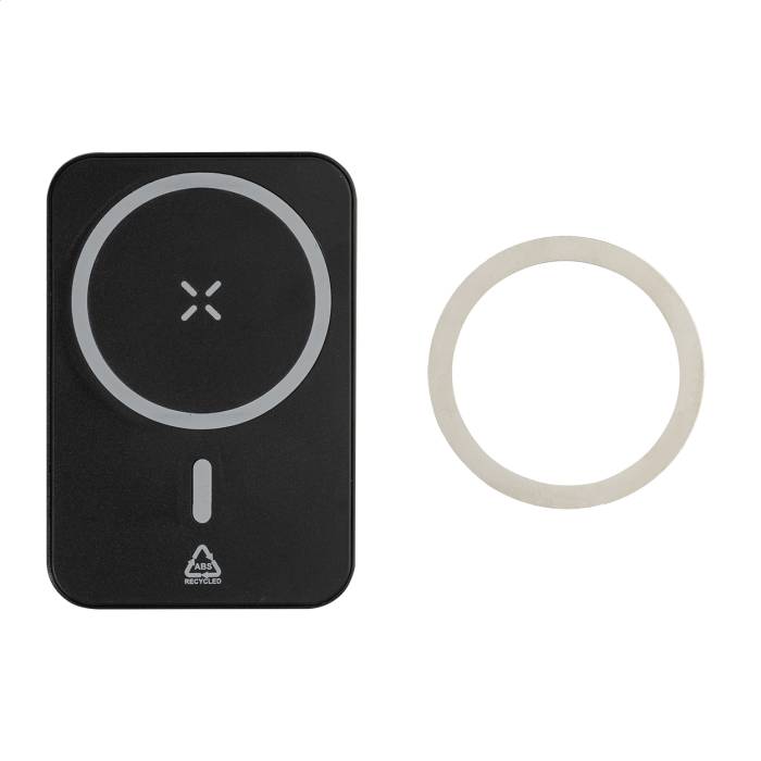 Újrahasznosított ABS műanyag power bank 5000 mAh-s akkumulátorral és beépített mágneses vezeték nélküli gyorstöltővel (15W). USB-C bemenettel és töltőporttal. Öntapadós fémgyűrűvel a mágneses funkció használatához, bármilyen vezeték nélkül tölthető eszközhöz. Kompatibilis az iPhone® 12 vagy újabb készülékekkel. USB töltőkábellel.