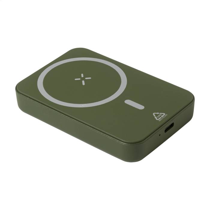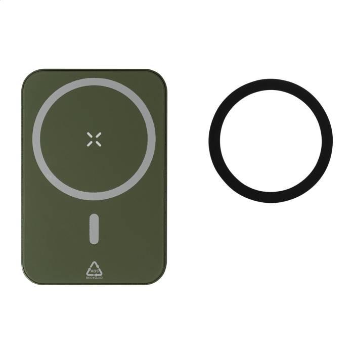 Újrahasznosított ABS power bank 5000 mAh akkumulátorral és beépített mágneses vezeték nélküli töltővel (5W). USB-C bemenettel és töltőporttal. Öntapadó fémgyűrűvel, amellyel bármilyen vezeték nélkül tölthető eszközön használhatja a mágneses funkcióját. Kompatibilis az iPhone® 12 vagy újabb készülékekkel. USB töltőkábellel.