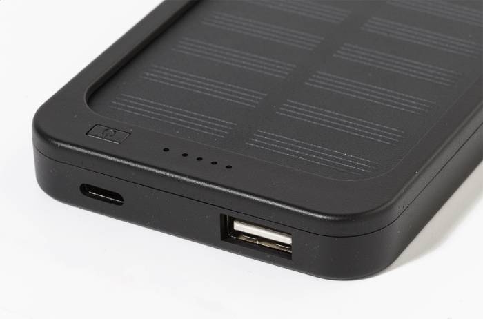 Újrahasznosított ABS műanyag power bank beépített napelemes töltővel és 4000 mAh-s akkumulátorral. 1 USB és 1 USB-C töltőporttal. USB-C bemeneti porttal. USB töltőkábellel.