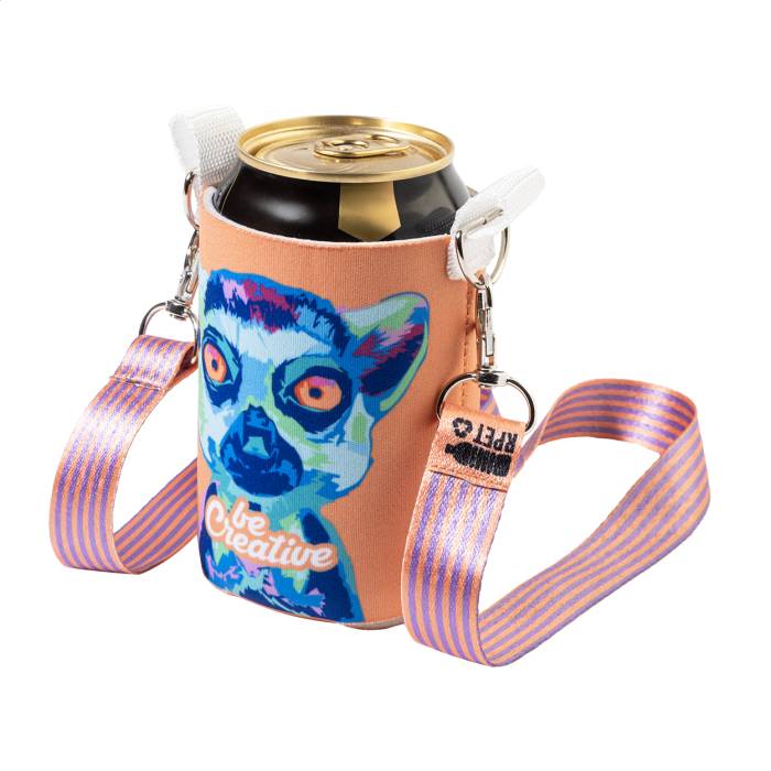 Egyedi gyártású, RPET neoprén hűtőhuzat 0,33 literes alumínium italos dobozokhoz, full-colour nyomtatott RPET nyakpánttal, fém karabinerekkel. Teljes felületén szublimációs nyomtatott grafikával. Minimális rendelési mennyiség: 100 db.