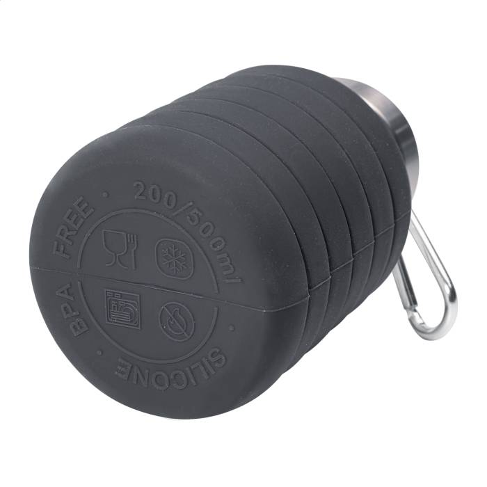 Összecsukható szilikon kulacs rozsdamentes acél tetővel és alumínium karabinerrel. 500 ml.