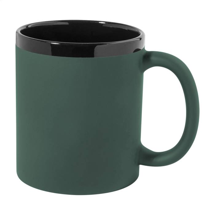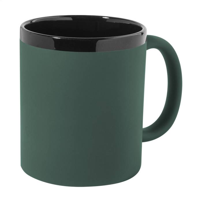Kerámia bögre puha, gumírozott felülettel, fekete belsővel és szegéllyel, 300 ml. Speciális bevonattal rendelkezik, a gravírozott logó megegyezik a belső színnel. Kraft papír dobozban.