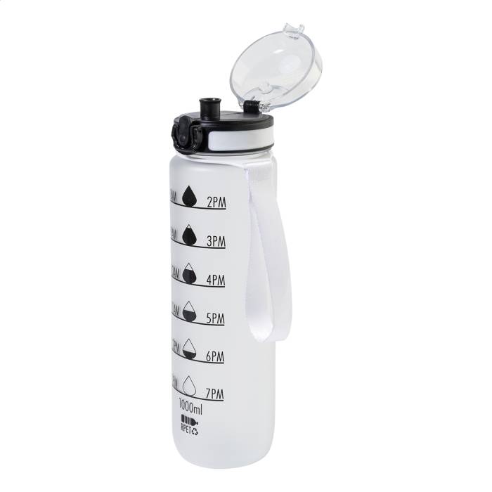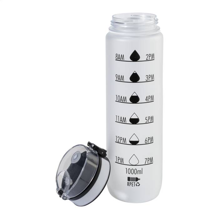 Matt felületű RPET sportkulacs motivációs mennyiség- és időjelzésekkel, automatikusan nyíló, pattintható tetővel, biztonsági zárral és hordpánttal. 1000 ml.