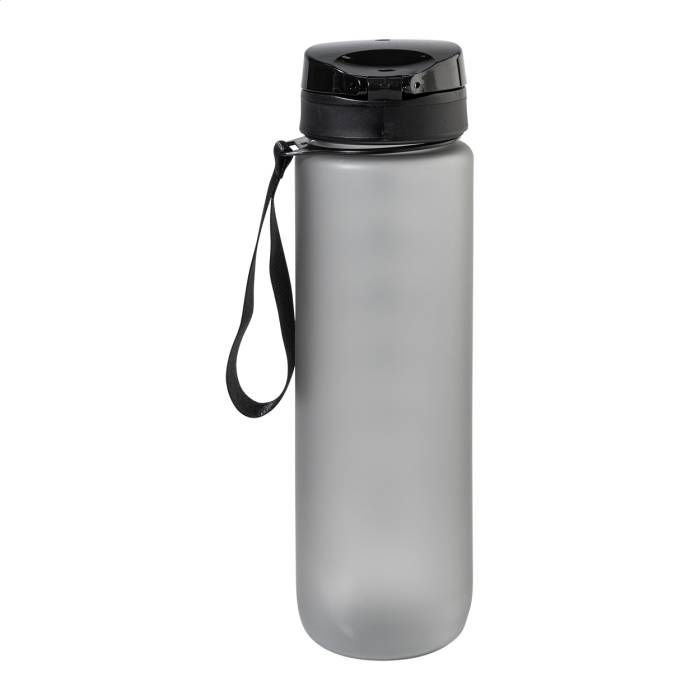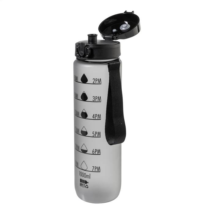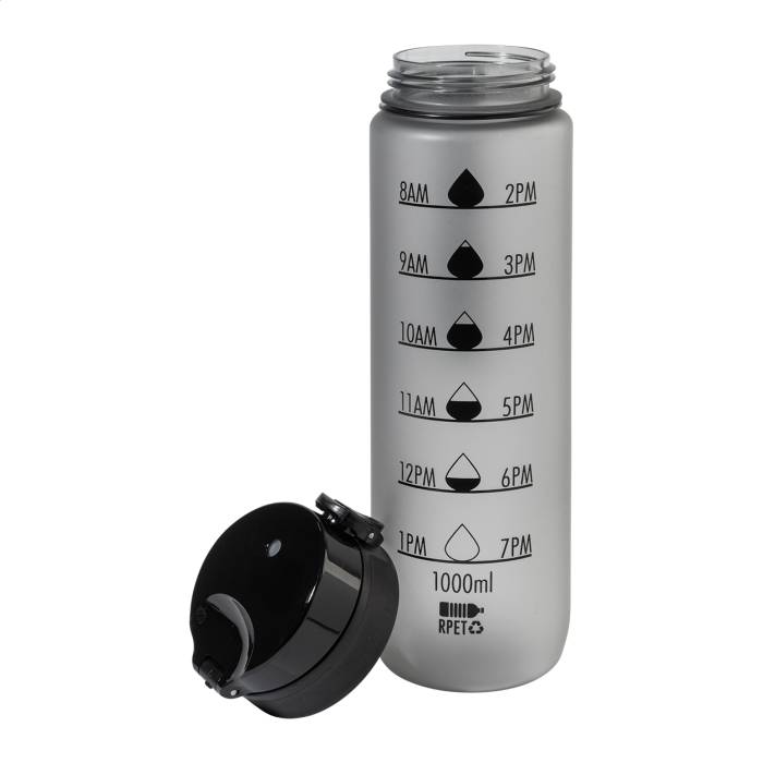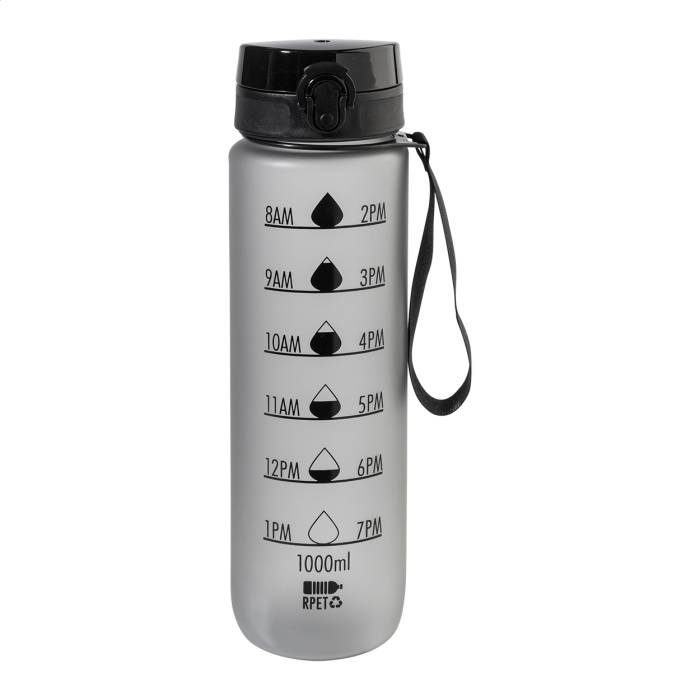 Matt felületű RPET sportkulacs motivációs mennyiség- és időjelzésekkel, automatikusan nyíló, pattintható tetővel, biztonsági zárral és hordpánttal. 1000 ml.