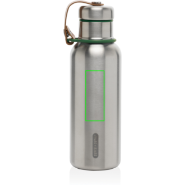 A rozsdamentes acélból készült, szigetelt vizespalack egy elegáns, vákuumzáras palack ami 24 órán át hidegen illetve 12 órán át melegen tartja az italokat. A fedél is teljesen rozsdamentes acélból készült, ami azt jelenti, hogy a víz nem érintkezik műanyaggal. A műbőr hordozóhurokként funkcionál, valamint egy szép dizájnelem. Kizárólag kézzel mosható.