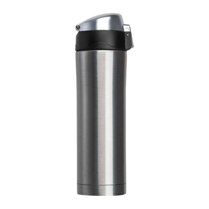 Szivárgásmentes, vákuumszigetelt duplafalú rozsdamentes acél ivópalack. Biztonsági zárral és nyomógombos nyitással ellátva. Űrtartalom: 500 ml.