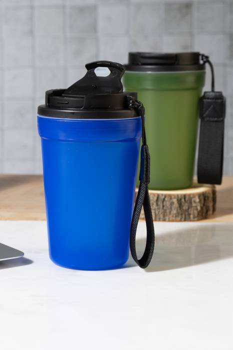 Egyfalú, matt felületű PP műanyag utazópohár ivófedéllel és RPET poliészter hordpánttal. 400 ml.