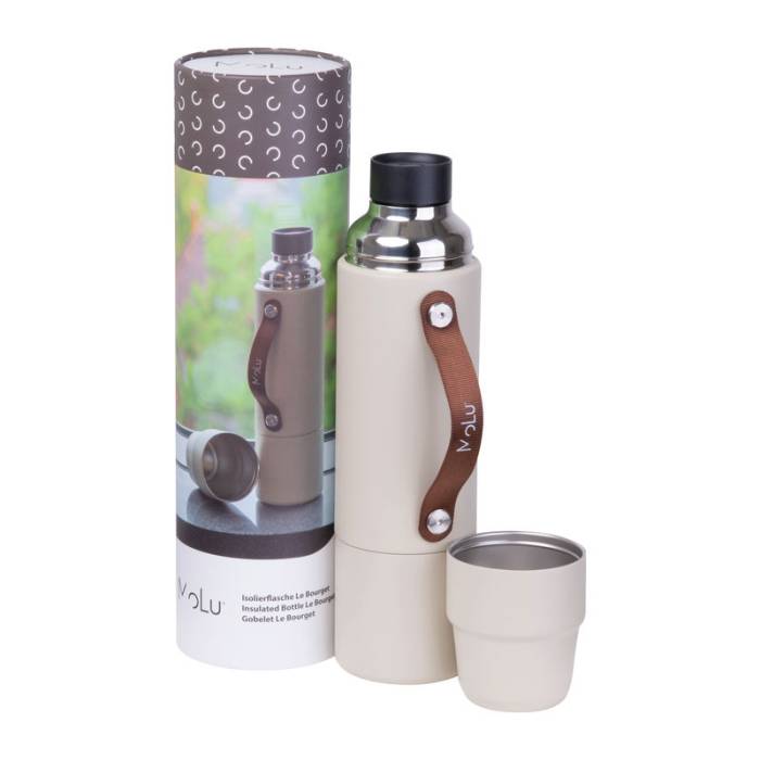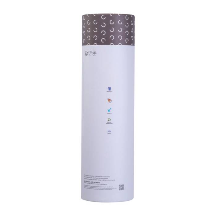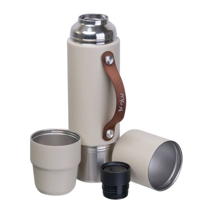 Újrahasznosított rozsdamentes acélból, duplafalú rézszigeteléssel – 20 órán át tartja a hőt. Két beépített pohárral: egy a kupakban, egy az alján. Barna fogantyúval a kényelmes használathoz. Praktikus és tartós társ az úton.