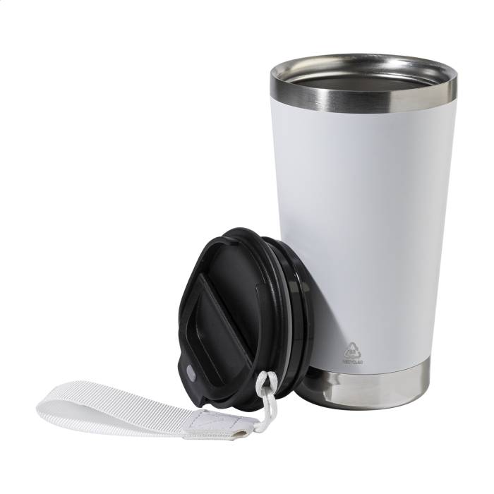 Duplafalú, újrahasznosított rozsdamentes acél thermo pohár PP műanyag fedéllel és hozzáillő színű hordszíjjal. 430 ml.