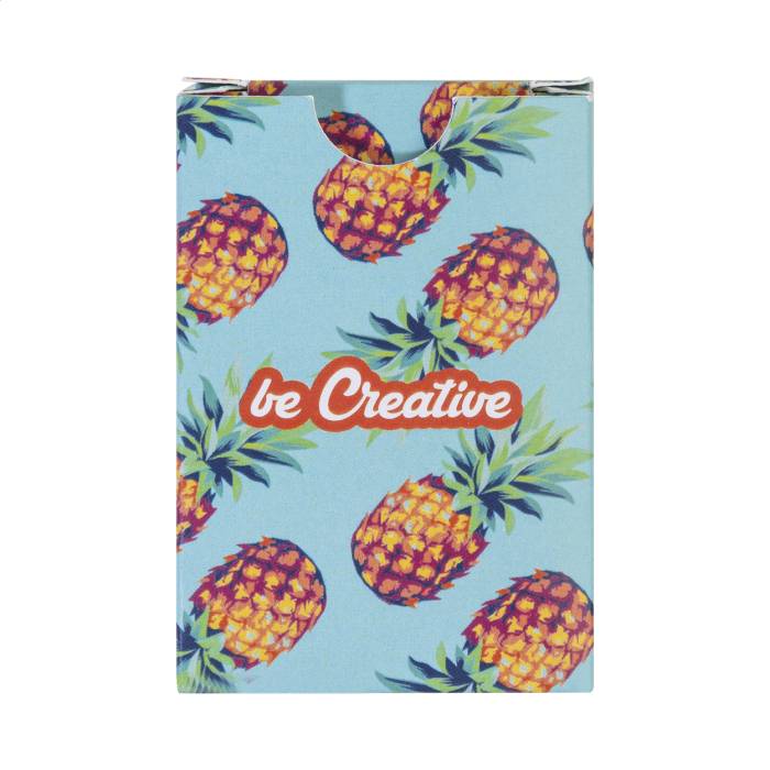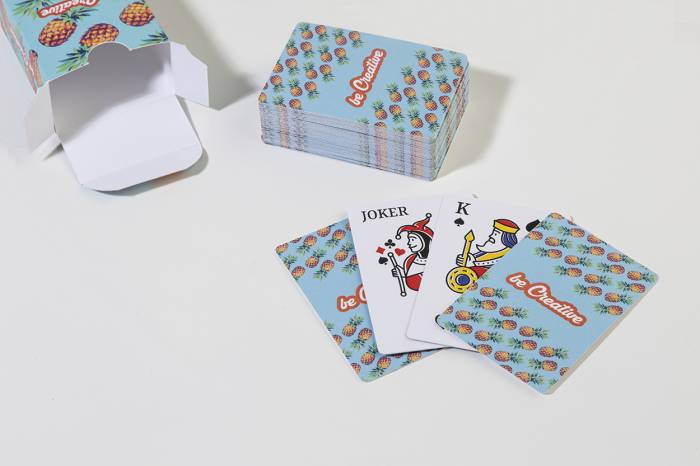 Egyedi készítésű, mini utazó méretű klasszikus francia kártyák papírdobozban. Egy standard pakli 54 kártyával. Az ár tartalmazza a full-colour nyomtatású dobozt és az azonos színes nyomtatást minden kártya hátoldalán. Minimális rendelési mennyiség: 100 db.