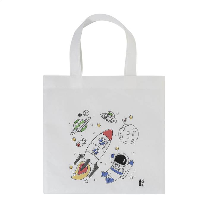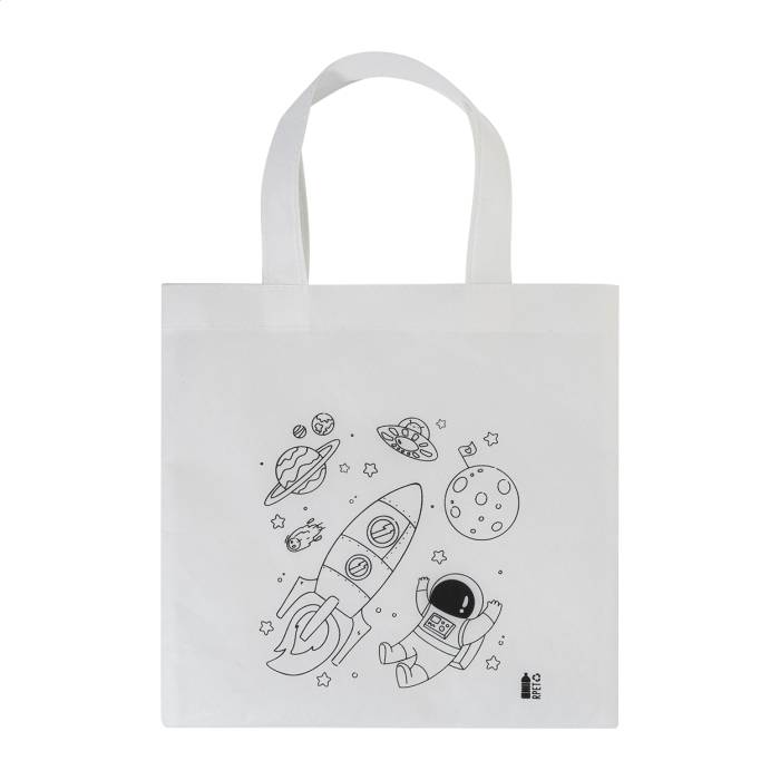 RPET non-woven anyagú, színezhető mini bevásárlótáska gyerekeknek 5 zsírkrétával.