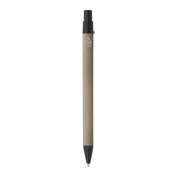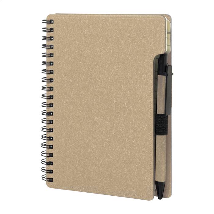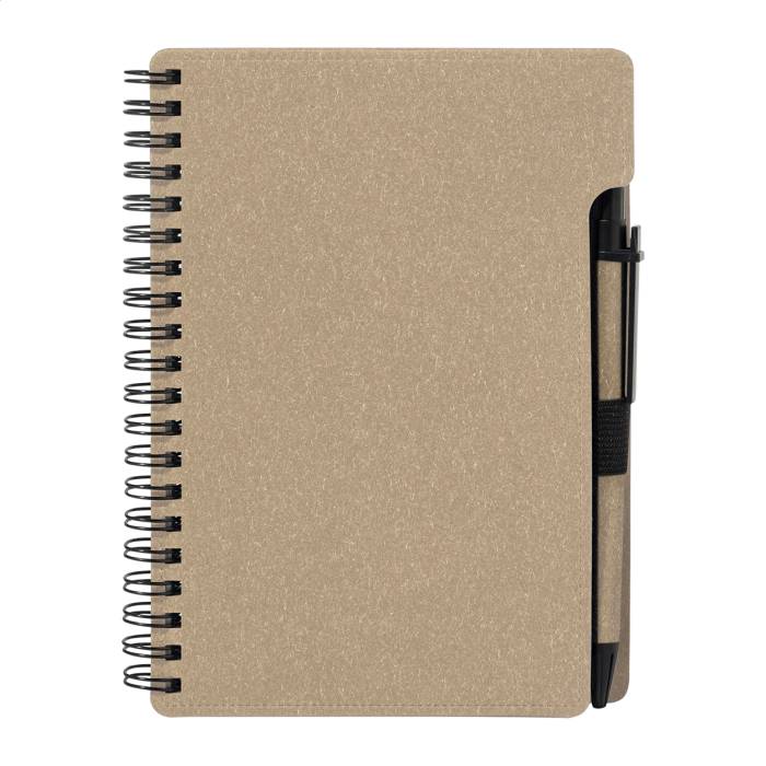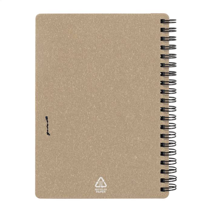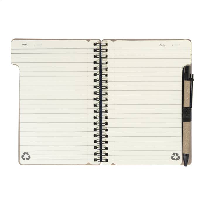 Újrahasznosított papír spirál jegyzetfüzet 80 vonalas lappal. A6 méretű. Tartalmaz egy újrahasznosított papír és újrahasznosított PP anyagú golyóstollat kék tollbetéttel.