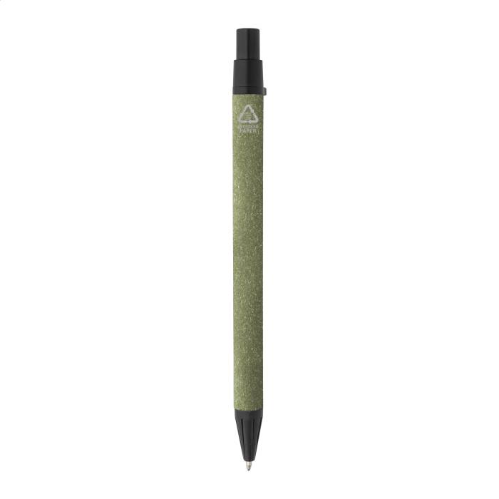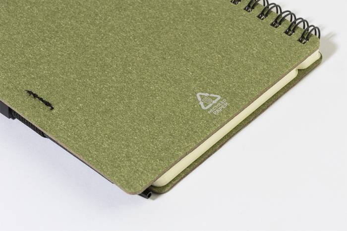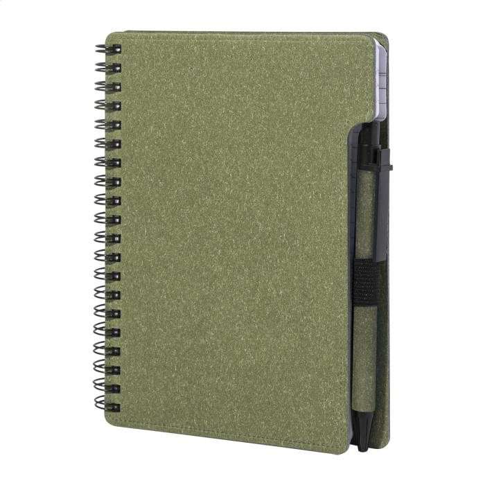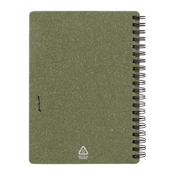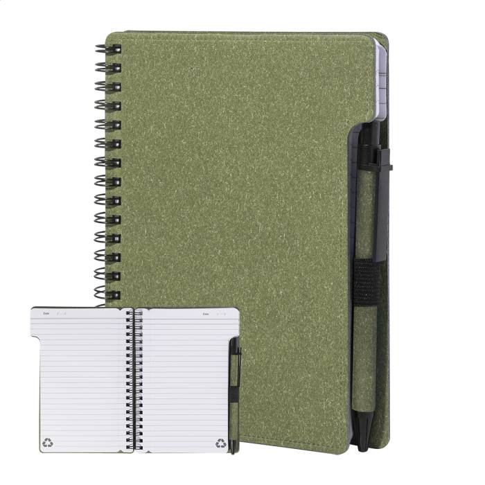 Újrahasznosított papír spirál jegyzetfüzet 80 vonalas lappal. A6 méretű. Tartalmaz egy újrahasznosított papír és újrahasznosított PP anyagú golyóstollat kék tollbetéttel.
