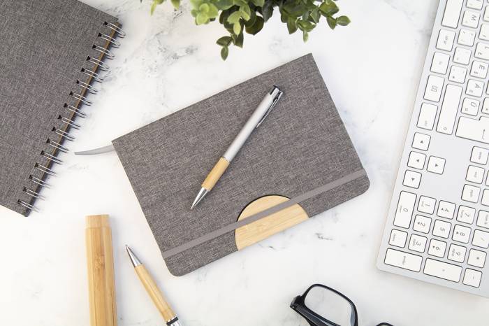 RPET poliészter borítású spirál jegyzetfüzet bambusz betéttel és telefon-tartó funkcióval. 80 újrahasznosított papírból készült vonalas lappal, gumis pánttal és könyvjelzővel. A5 méretű.