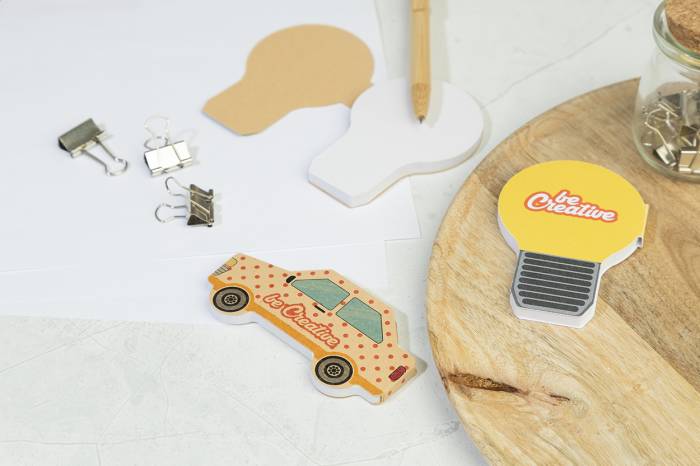 Egyedi gyártású, autó alakú öntapadós jegyzettömb újrahasznosított kraft papír borítással. 50 újrahasznosított papírból készült öntapadós jegyzetlapot tartalmaz. Az ár tartalmazza a full-colour nyomtatott külső borítót. Minimális rendelési mennyiség: 100 db.