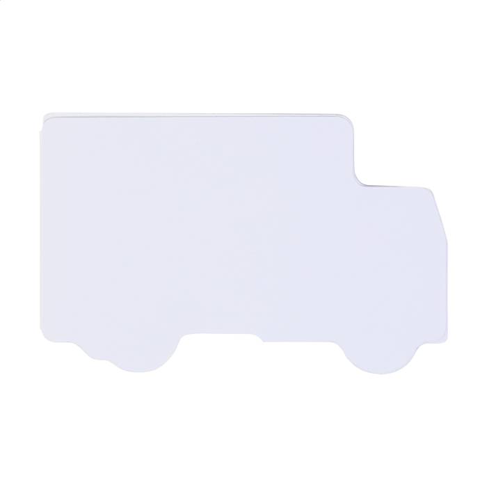 Egyedi gyártású, teherautó alakú öntapadós jegyzettömb papír borítással. 50 újrahasznosított papírból készült öntapadós jegyzetlapot tartalmaz. Az ár tartalmazza a full-colour nyomtatott külső borítót. Minimális rendelési mennyiség: 100 db.