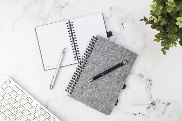 RPET filc borítású spirál jegyzetfüzet, megkülönböztető RPET címkével és 80, újrahasznosított papírból készült vonalas lappal. A5 méretű.