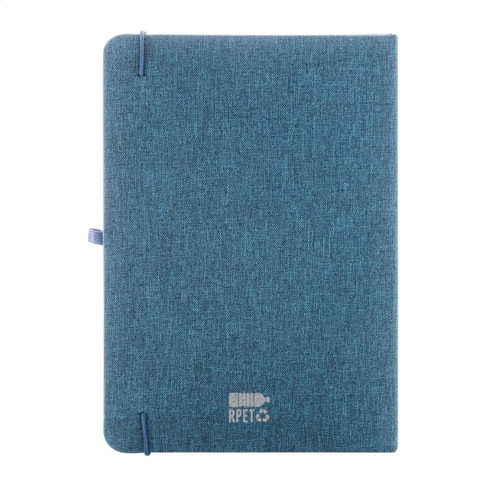300D RPET poliészter borítású jegyzetfüzet 80 sima lappal. Hozzáillő színű gumipánttal, könyvjelzővel és tolltartóval. A5 méretű.