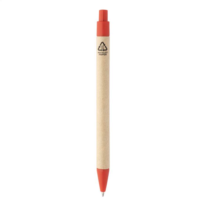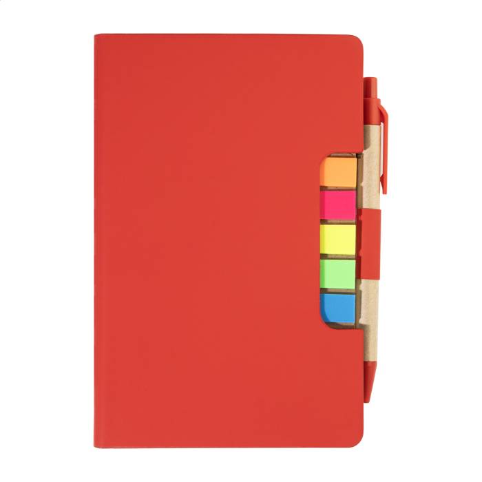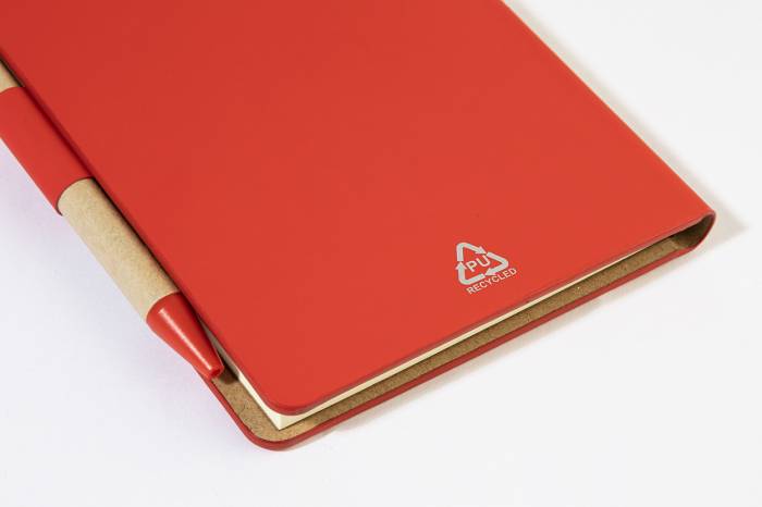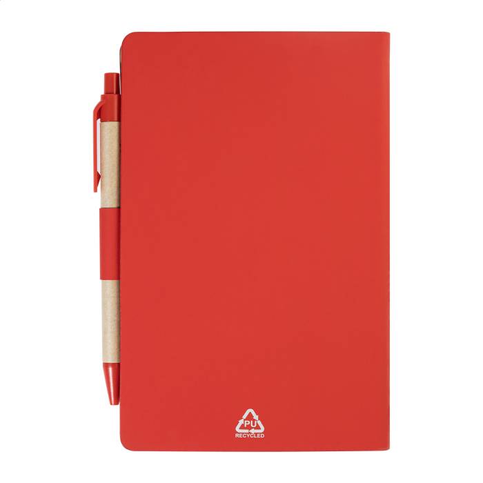 Újrahasznosított PU műbőrrel borított jegyzetfüzet 70 vonalas lappal újrahasznosított papírból és 125 oldaljelölővel (5 különböző színben). Tartalmaz egy újrahasznosított papír és újrahasznosított PP anyagú golyóstollat kék tollbetéttel.
