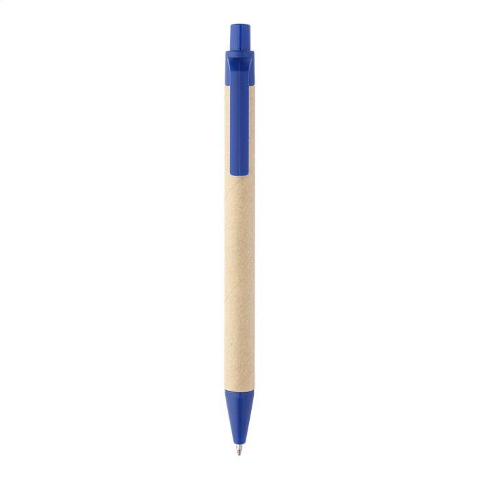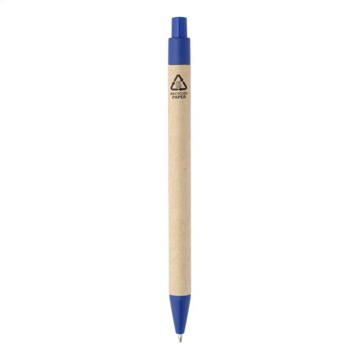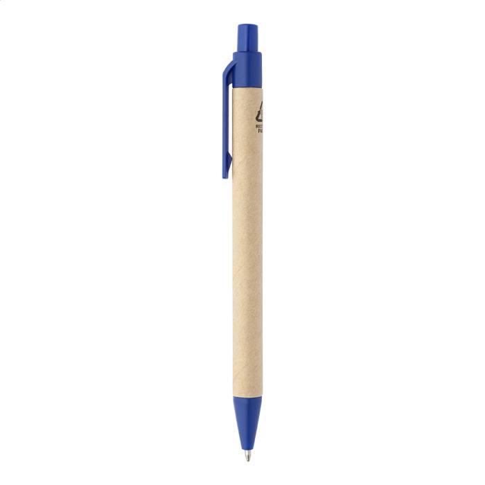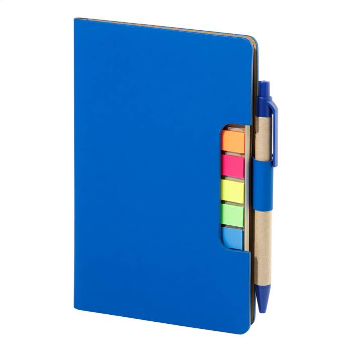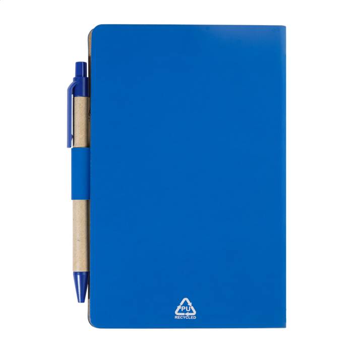 Újrahasznosított PU műbőrrel borított jegyzetfüzet 70 vonalas lappal újrahasznosított papírból és 125 oldaljelölővel (5 különböző színben). Tartalmaz egy újrahasznosított papír és újrahasznosított PP anyagú golyóstollat kék tollbetéttel.