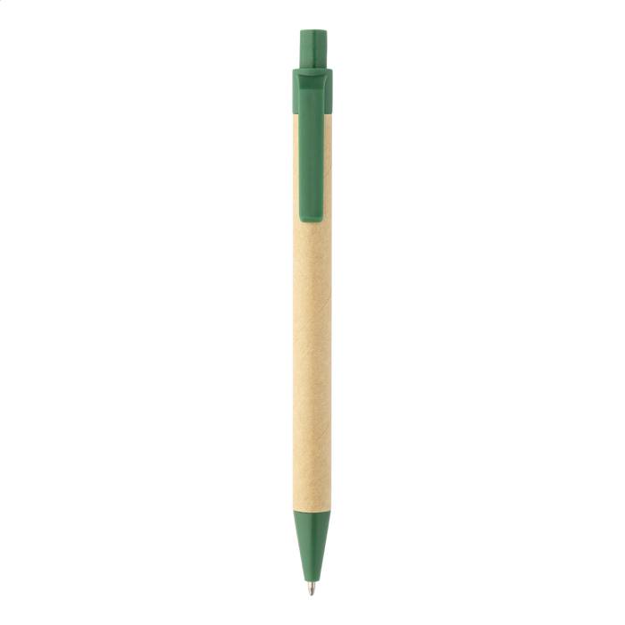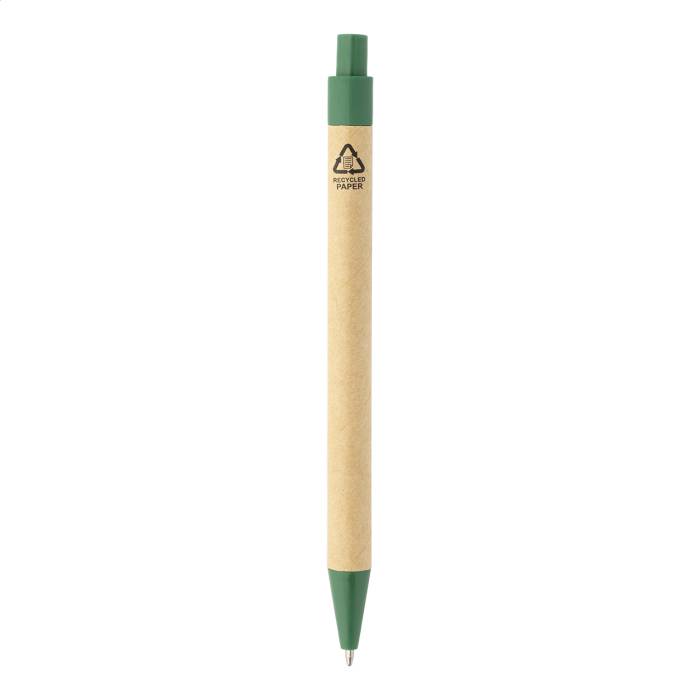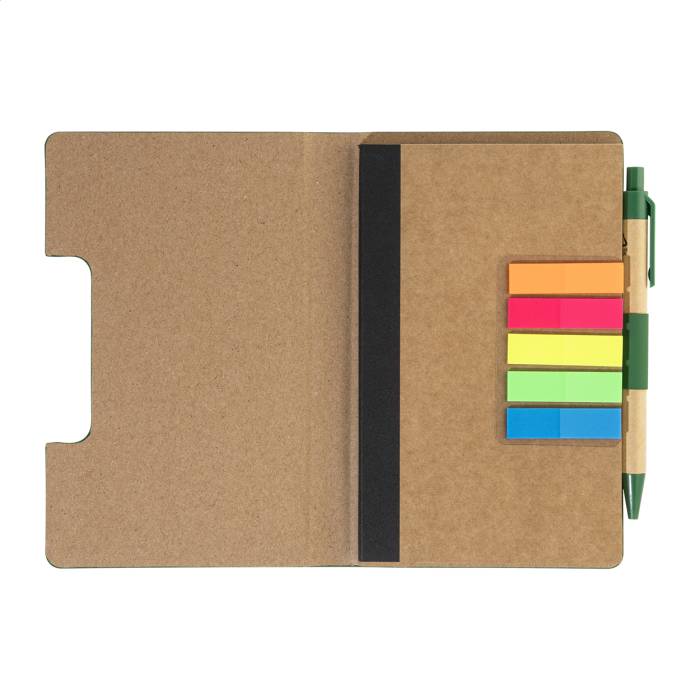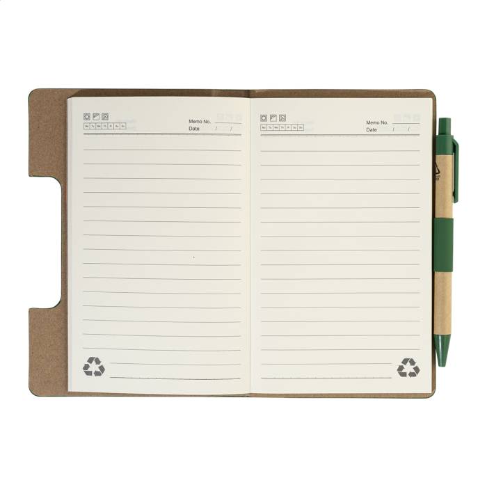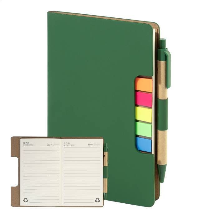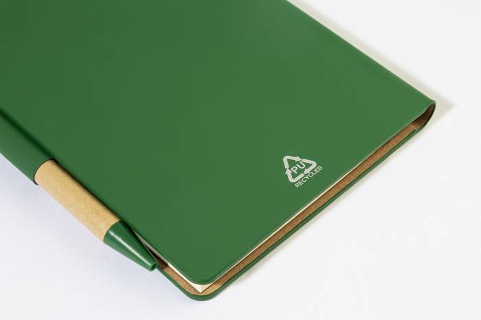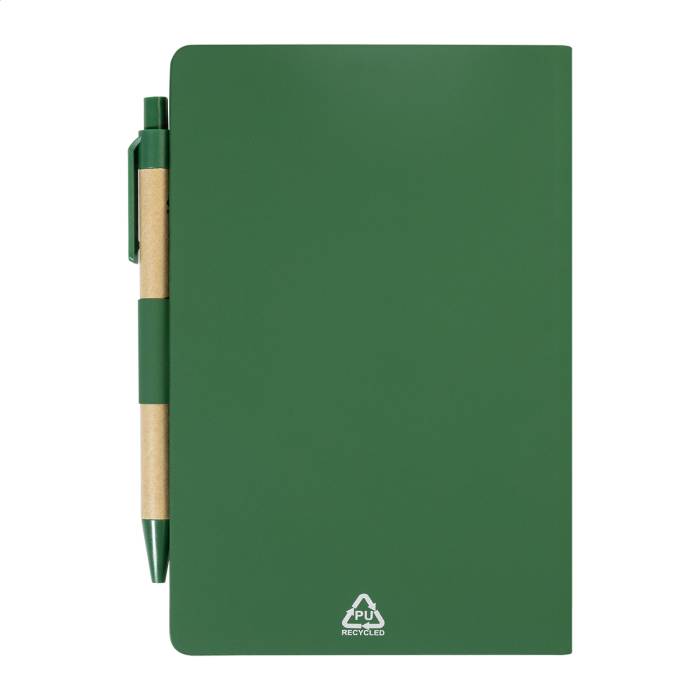 Újrahasznosított PU műbőrrel borított jegyzetfüzet 70 vonalas lappal újrahasznosított papírból és 125 oldaljelölővel (5 különböző színben). Tartalmaz egy újrahasznosított papír és újrahasznosított PP anyagú golyóstollat kék tollbetéttel.