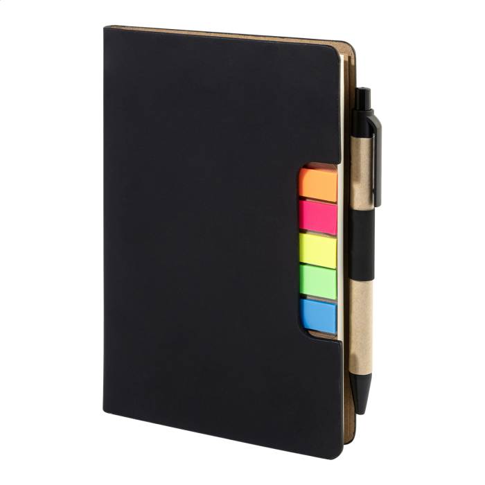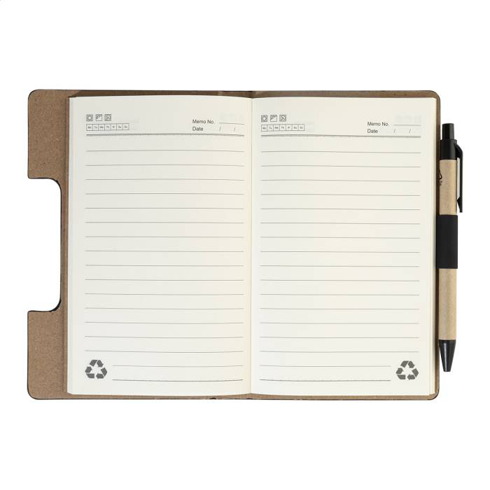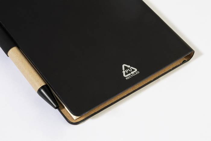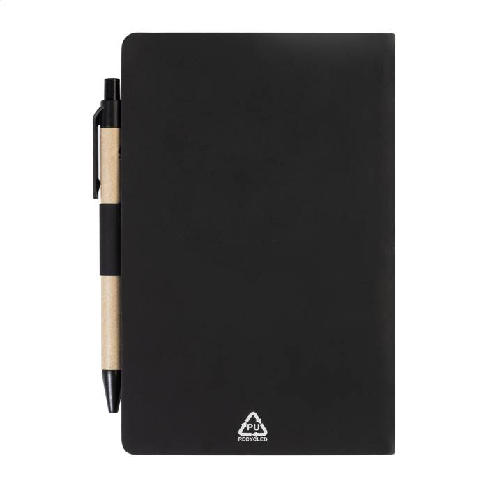 Újrahasznosított PU műbőrrel borított jegyzetfüzet 70 vonalas lappal újrahasznosított papírból és 125 oldaljelölővel (5 különböző színben). Tartalmaz egy újrahasznosított papír és újrahasznosított PP anyagú golyóstollat kék tollbetéttel.