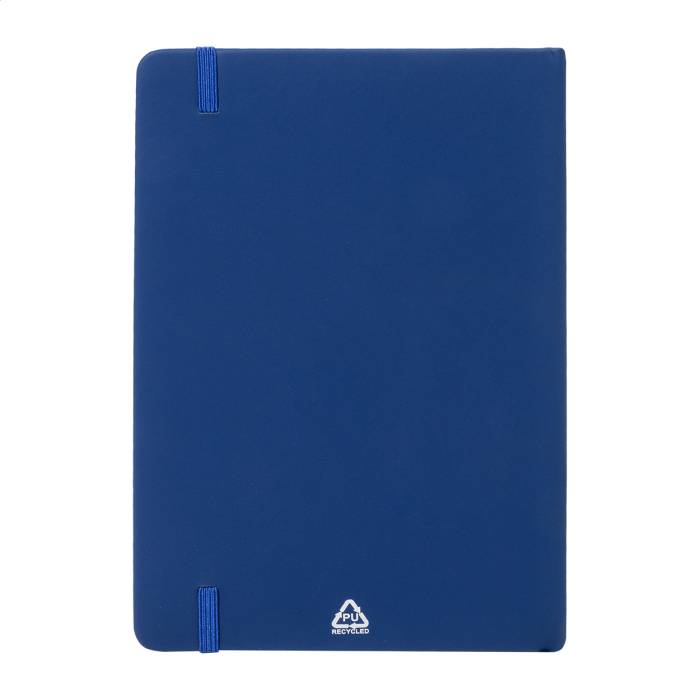 Úrahasznosított PU bőr borítású jegyzetfüzet újrahasznosított papírból készült 100 sima lappal. Hozzáillő színű gumipánttal és könyvjelzővel. A5 méretű.
