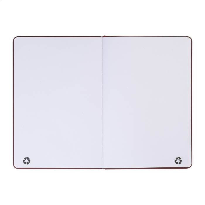 Úrahasznosított PU bőr borítású jegyzetfüzet újrahasznosított papírból készült 100 sima lappal. Hozzáillő színű gumipánttal és könyvjelzővel. A5 méretű.