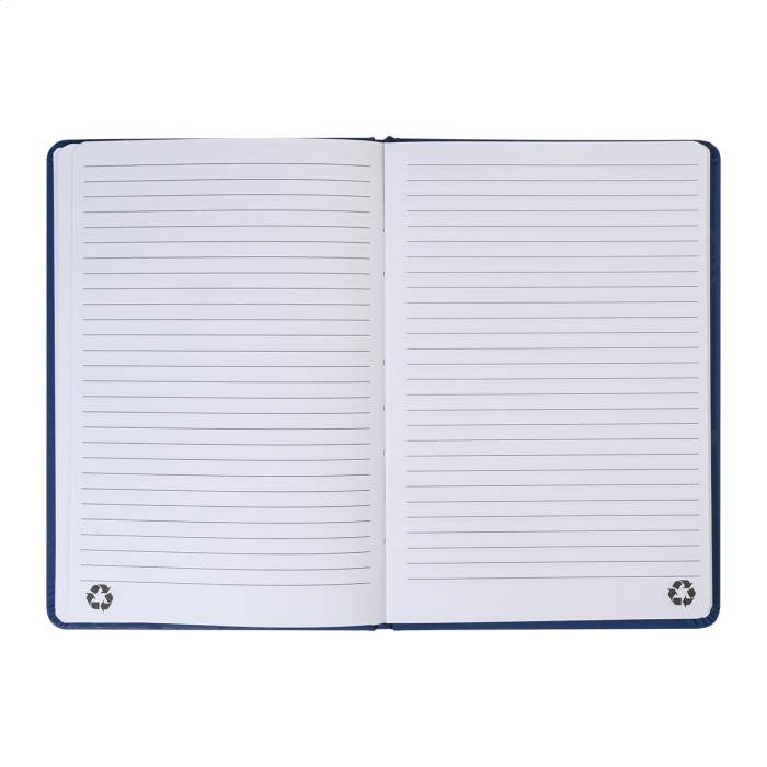 Újrahasznosított PU bőr borítású jegyzetfüzet 100 vonalas lappal, újrahasznosított papírból. Megegyező színű könyvjelzővel és gumiszalaggal. A5 méretű.