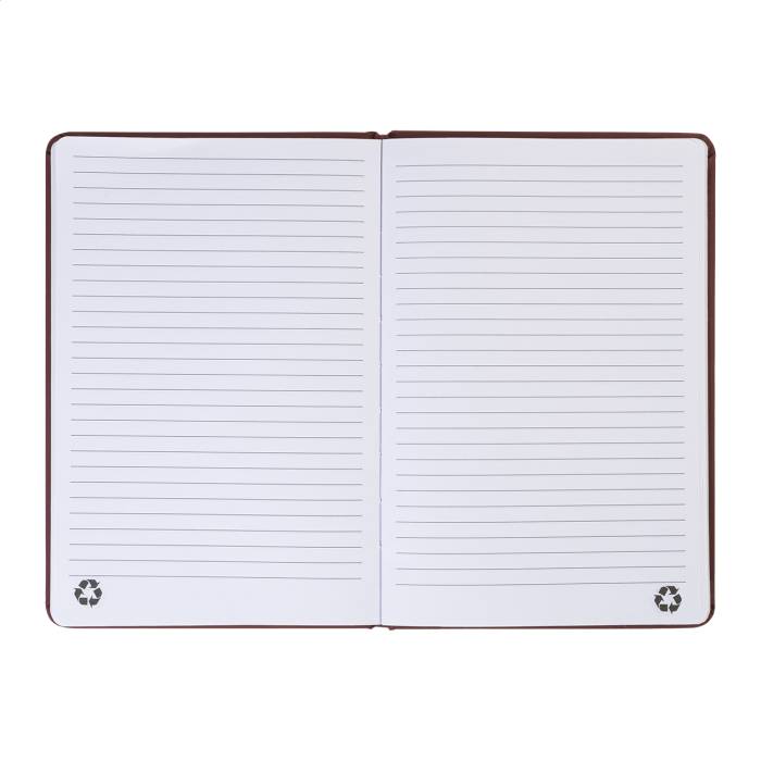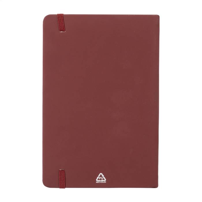 Újrahasznosított PU bőr borítású jegyzetfüzet 100 vonalas lappal, újrahasznosított papírból. Megegyező színű könyvjelzővel és gumiszalaggal. A5 méretű.
