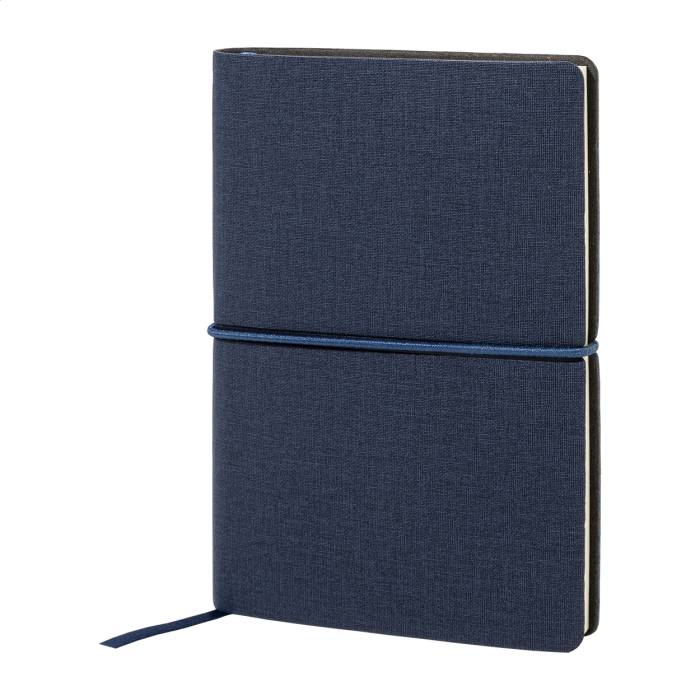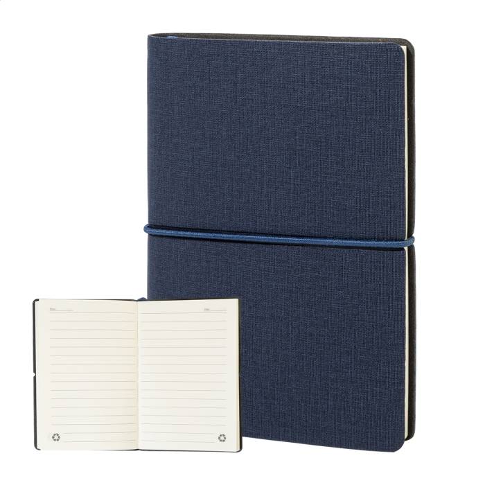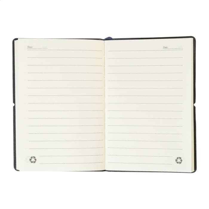 Újrahasznosított PU műbőrrel borított jegyzetfüzet 70 vonalas lappal, 25 öntapadós jegyzetlappal és 125 oldaljelölővel (5 különböző színben). Könyvjelzővel és vízszintes gumipánttal. A6-os méret.