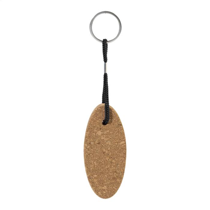 Természetes parafából készült lebegő kulcstartó poliészter zsinórral és fém karikával.