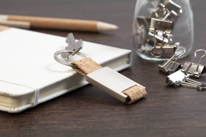 Téglalap alakú, fém kulcstartó természetes parafa pánttal és fém karikával.