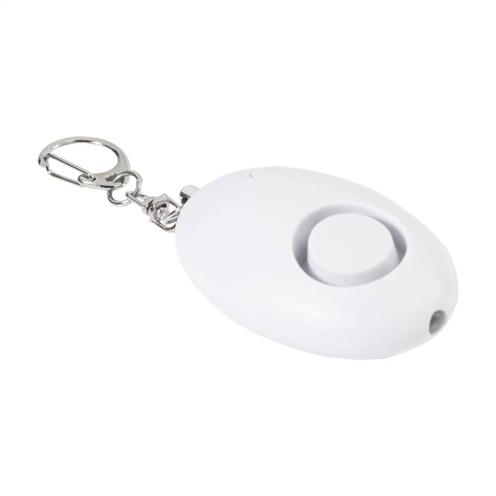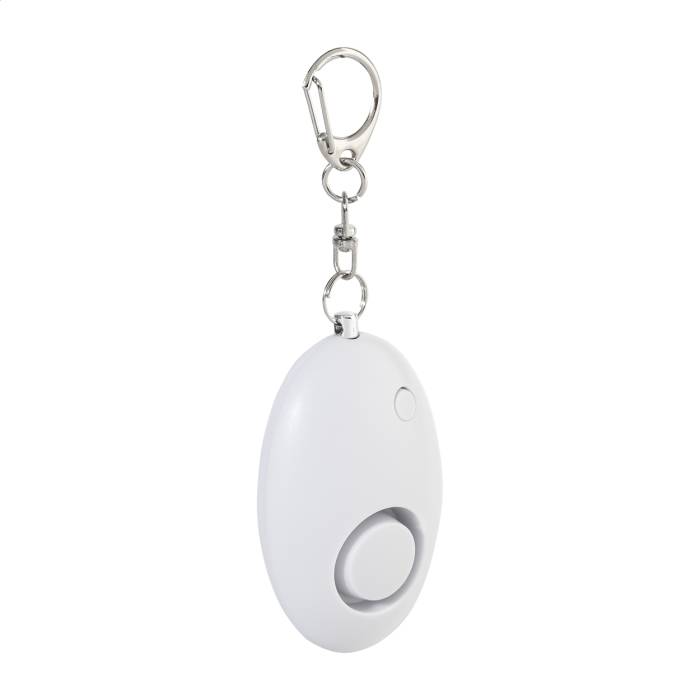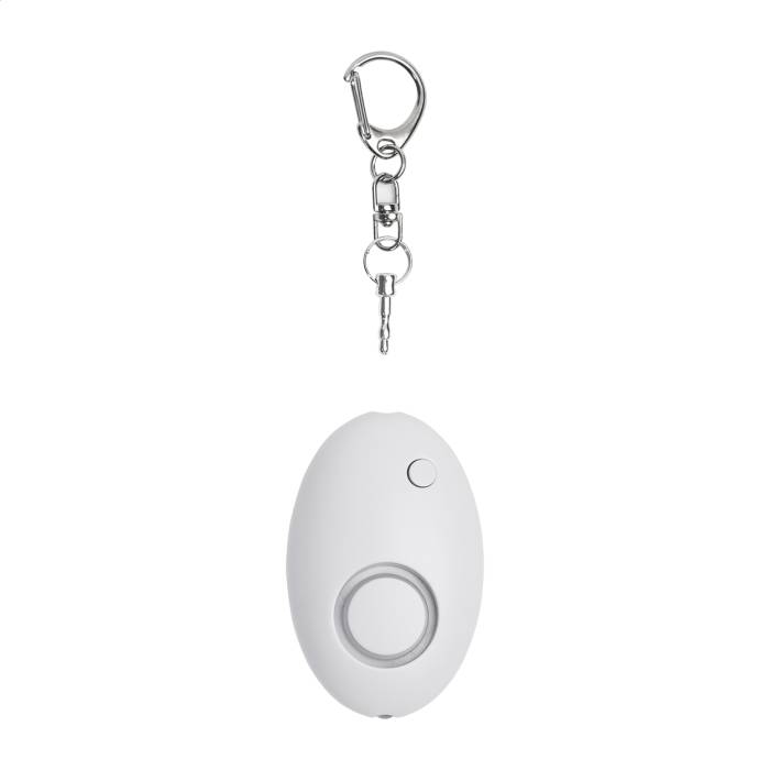 Újrahasznosított ABS személyi riasztó fém karabineres kulcstartóval és 1 LED zseblámpával. A riasztó a rögzítőzár kihúzásakor aktiválódik. Riasztási hangerő: kb. 100 dB. Gombelemmel szállítjuk.