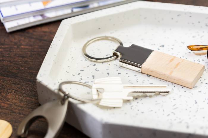 Téglalap alakú fém és bükkfa kulcstartó fém karikával.