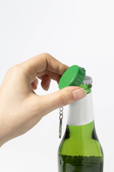 Újrahasznosított ABS műanyagból készült, kupak alakú kulcstartó üvegnyitóval.