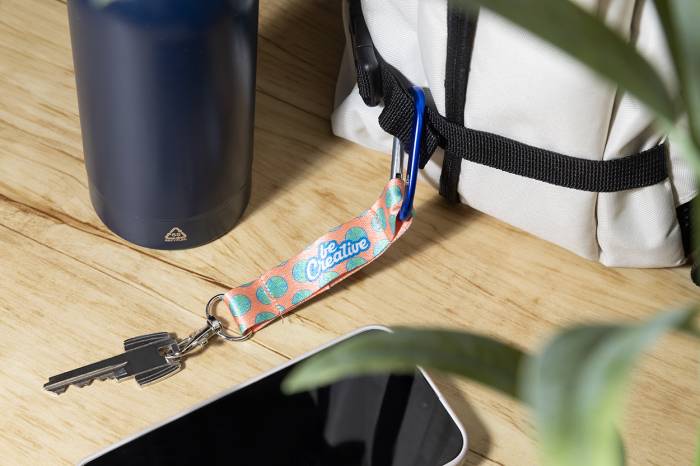 Egyedi gyártású, RPET poliészter mini kulcstartó, mindkét oldalán szublimációs nyomtatott grafikával. Kis fém és nagy újrahasznosított alumínium karabinerekkel. Minimális rendelési mennyiség: 100 db.