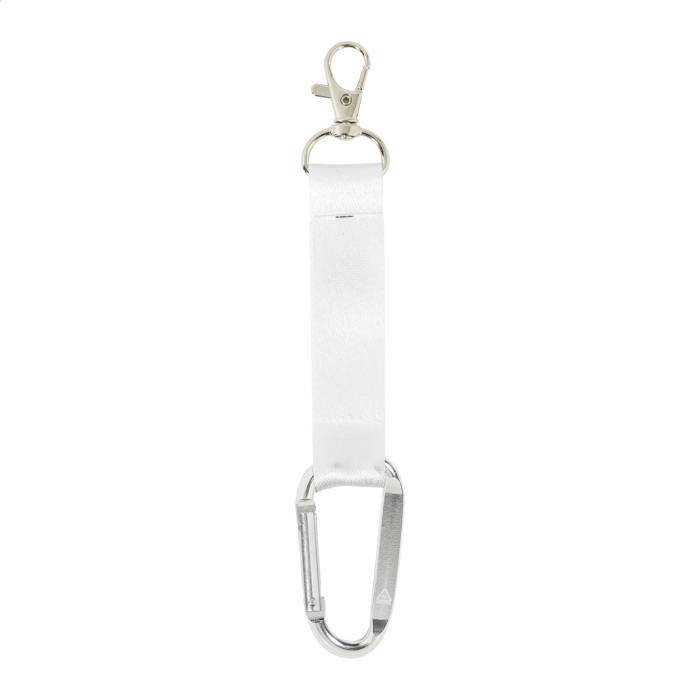 Egyedi gyártású, RPET poliészter mini kulcstartó, mindkét oldalán szublimációs nyomtatott grafikával. Kis fém és nagy újrahasznosított alumínium karabinerekkel. Minimális rendelési mennyiség: 100 db.